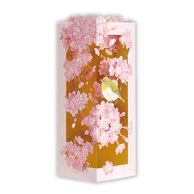 金屏風のような背景に、春の風物詩である桜とメジロがデザインされた立体カード。