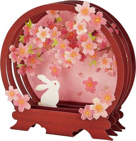 丸棚の中でウサギが桜を見上げている立体カード。桜にはキラキラ輝くラメ加工が施されています。