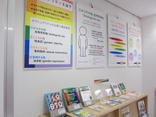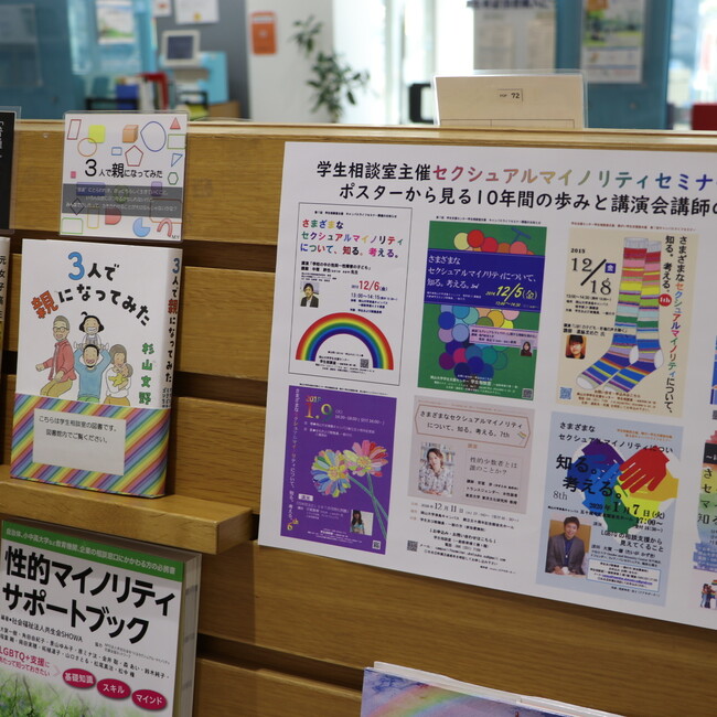 セクシュアルマイノリティ啓発に関するパネルや、学生相談室所属のピアサポーターの学生さんが作成した紹介ポップをつけた関連図書を多数展示しています。ご来館の際にぜひお立ち寄りいただき、「多様な性」のあり方について理解を深めていただければ幸いです。