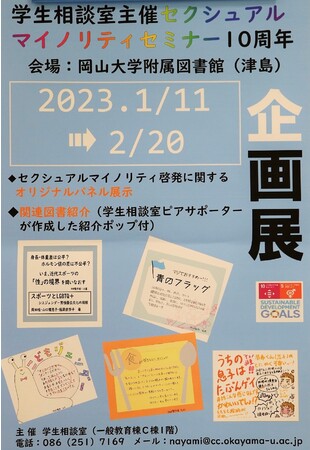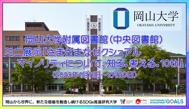 国立大学法人岡山大学(本部:岡山市北区、学長:槇野博史)の津島キャンパスにある岡山大学附属図書館(中央図書館)では、2023年1月11日から「さまざまなセクシュアルマイノリティについて、知る。考える。10th」と題したミニ展示を行っています。