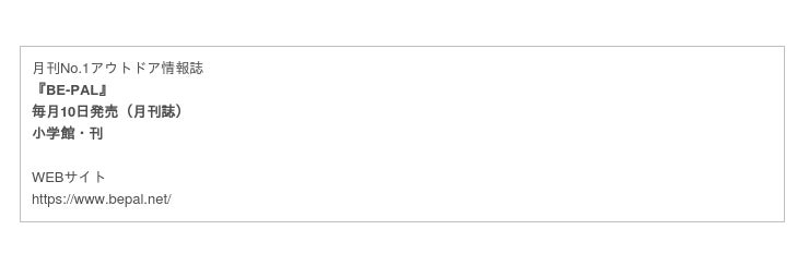 アウトドアを知り尽くした『BE-PAL』だからこそできる特別付録とあいまって、単なる“ブーム”に留まることなく、これからも、誰でも楽しめる身近なアウトドア体験をナビゲートしていきます。