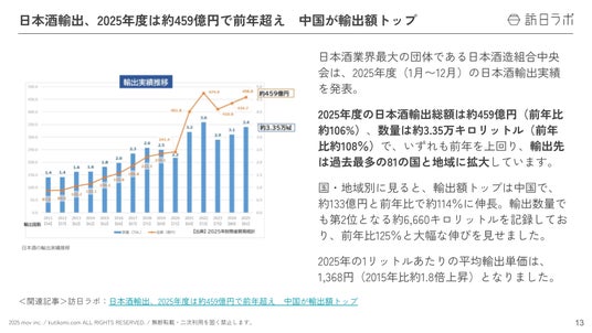 - 日本酒輸出、2025年度は約459億円で前年超え 中国が輸出額トップ
