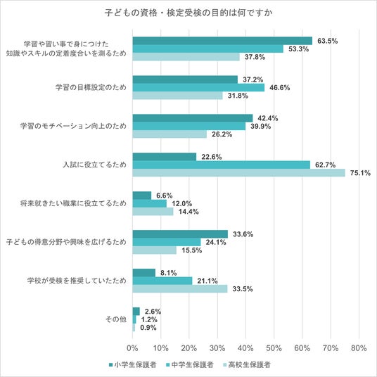 高校生保護者で最も多かった回答は「入試に役立てるため」で75.1%だった。また、「学校が受検を推奨していたため」という回答は、小学生保護者・中学生保護者と比べて多かった。