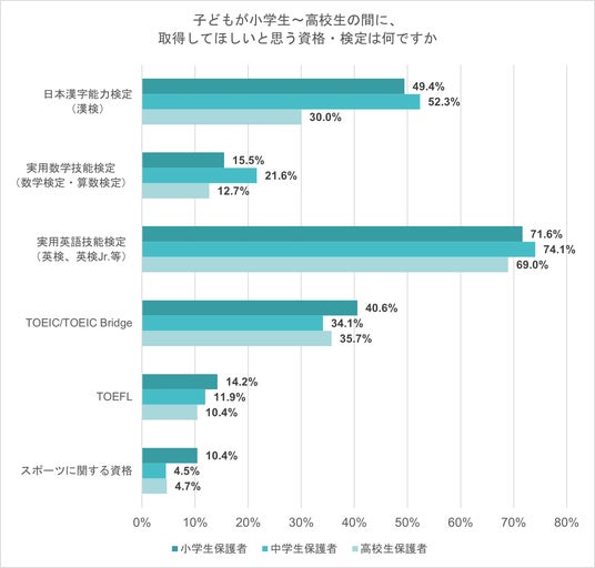 また、取得してほしい資格・検定の種類を聞いたところ、最も多かったのは「実用英語技能検定(英検(R)、英検Jr. (R)等)」で約7割、次いで「日本漢字能力検定(漢検)」、「TOEIC(R)/TOEIC Bridge(R)」となった。