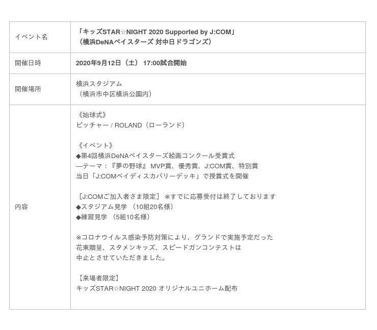 横浜DeNAベイスターズのオフィシャルスポンサーである株式会社ジェイコム湘南・神奈川(所在地:神奈川県横浜市、代表取締役社長:國分 孝夫)は、「キッズSTAR☆NIGHT 2020」に冠協賛し、大人から子どもたちへ贈るスペシャルイベント「キッズSTAR☆NIGHT 2020 Supported by J:COM」を開催します。本イベントは2020年9月12日(土)、横浜スタジアムで行われる「横浜DeNAベイスターズ」対「中日ドラゴンズ」内で実施し、始球式をはじめ、様々なイベントを開催いたします。