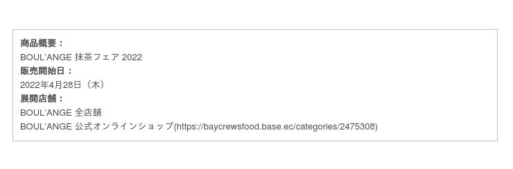 株式会社ベイクルーズ(本社: 東京都渋谷区、取締役CEO: 杉村 茂)が運営する、オリジナルブーランジェリー「BOUL’ANGE(ブール アンジュ)」は、京都宇治の老舗茶商「中村藤吉本店」の抹茶を使用した新作を4月28日(木)より販売開始いたします。