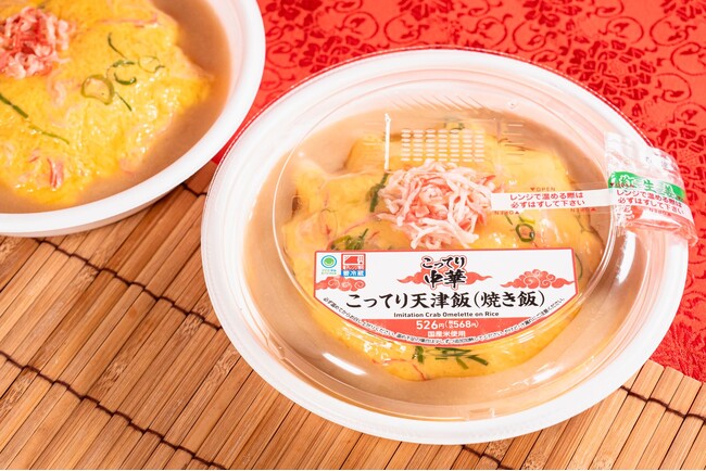 【内容】ふんわりとした食感のたまごに、鶏白湯スープを使用した鶏の旨味のあるあんをかけた天津飯です。ご飯は、あんとの相性がよい醤油ベースで味付けした焼き飯です。