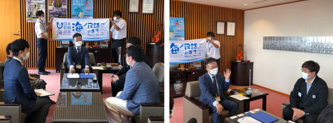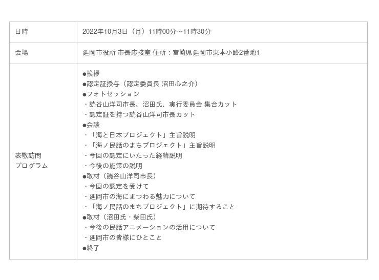 日本中に残された海にまつわる民話を発掘し、その民話のストーリーと、そこに込められた「想い」「警鐘」「教訓」を、親しみやすいアニメーションとして映像化します。当日は、認定委員長をはじめとする事務局メンバーが「海ノ民話のまち」として認定した15のエリアのうちの1つである宮崎県延岡市の読谷山洋司市長 を表敬訪問し、「海ノ民話のまち」認定証贈呈式を行いました。