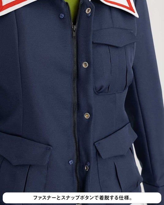 ポケットのフラップは面ファスナー仕様、ジャケットはファスナーとスナップボタンで着脱する仕様など、細部まで設定通りに仕立てたこだわりの一着。首元には「大洗女子学園」のタグがついています。