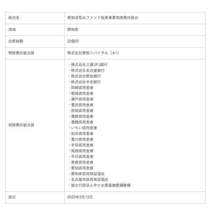 「愛知活性化ファンド投資事業有限責任組合」は、新型コロナウイルス感染症の影響による経営環境の悪化を背景とし、過剰債務等により業況は悪化しているものの、本業には相応の収益力があり再生が見込まれる中小企業に対し、財務改善のための投資と再生支援を行うことを目的とするファンドです。