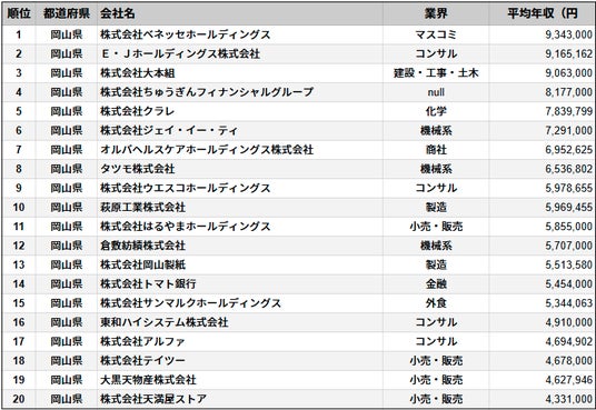 株式会社SalesNow(本社:東京都渋谷区、代表取締役:村岡功規、以下「当社」)は、国内540万社の企業情報を完全網羅した日本最大級のデータベース「SalesNow DB」より、上場企業を対象に岡山県に本社を置く企業の平均年収データを集計・分析し、「平均年収ランキング」として公開いたしました。