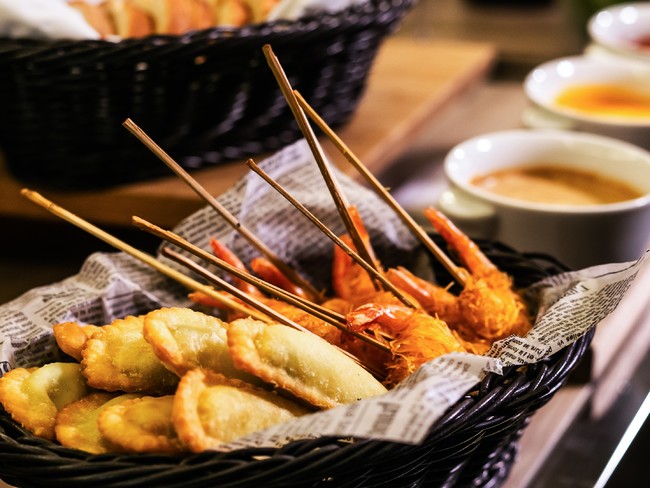 ハモンセラーノとパンコントマテをスライスバケットで、スモークサーモン ミニブリニ、カダイフシュリンプ、アッシェパルマンティエ、リコッタチーズとほうれん草のエンパナーダ、フルーツポップコーンなどスナック、ドライフルーツ&ナッツ&シード、ロータス オリジナルカラメルビスケットなど *メインプレート5種以外のメニューは、ブッフェスタイルでご提供いたします。