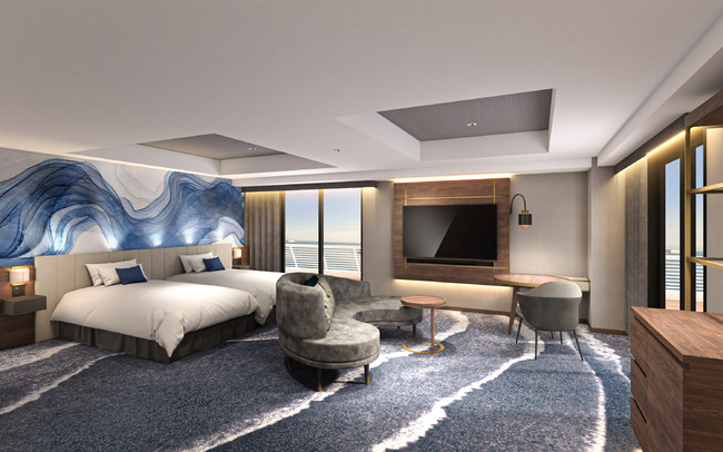 「エグゼクティブルーム」は、全室58平方メートル 以上(バルコニー面積含む)の広さのお部屋で、豪華客船の船内を連想させるくつろぎの空間となっております。昼夜で表情が変わる神戸港の景色を目の前に、プライベートな時間を贅沢にお過ごしいただけます。「エグゼクティブルーム」ご利用のお客様は、12:00までのレイトチェックアウトのほか、様々な特典サービスをご利用いただくことができ、柔らかな陽光が差し込む約30mの一面窓から行き交う客船や時間ごとに変わる美しい景色が一望できる「エグゼクティブラウンジ」をご利用いただけます。