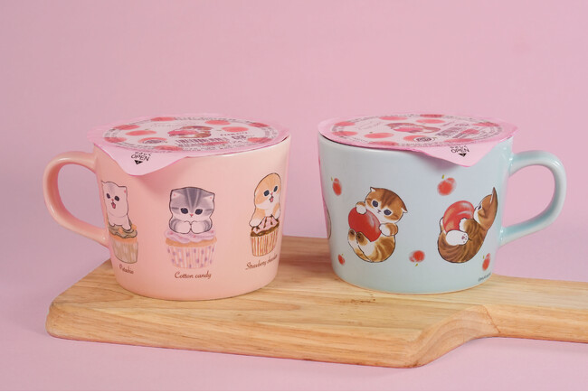 「mofusand」のイラストが描かれたマグカップ付きの白桃ゼリーも、2月20日(火)から発売いたします。2種類のかわいいマグカップをぜひお手に取ってみてください。