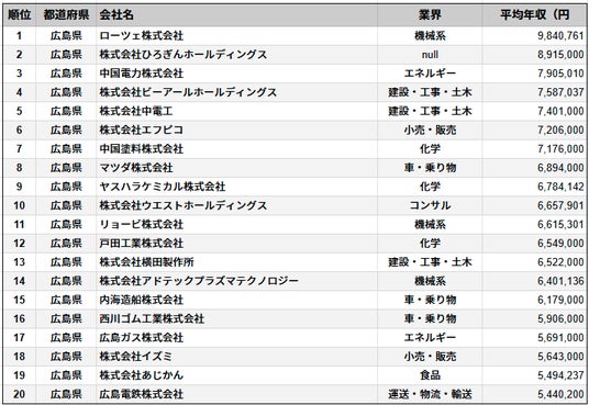 株式会社SalesNow(本社:東京都渋谷区、代表取締役:村岡功規、以下「当社」)は、国内540万社の企業情報を完全網羅した日本最大級のデータベース「SalesNow DB」より、上場企業を対象に広島県に本社を置く企業の平均年収データを集計・分析し、「平均年収ランキング」として公開いたしました。