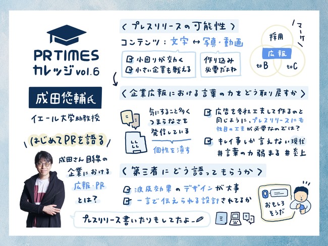 イェール大学助教授や起業家としての顔だけでなく、テレビでは爽快なコメントで視聴者から多数の支持を得るなど多くの分野で活躍される成田さんは、企業のPRについてどう考えているのでしょうか。「言葉の力~伝えること、伝わらないこと、あえて伝えないこと~」の背景には、写真や動画による情報が増えたこと。その世の中で想いを伝えるスピードや量への限界、そして、リスクを考えすぎることで表現の抑制が生まれているという現状があります。