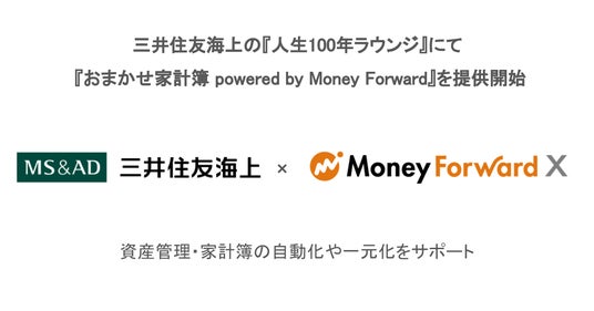 この度当社は、三井住友海上火災保険の『人生100年ラウンジ』に、『家計簿Unit』を『おまかせ家計簿 powered by Money Forward』の名称で提供します。三井住友海上火災保険が提供する『人生100年ラウンジ』の契約企業の皆さまは、『人生100年ラウンジ』上で、複数金融機関の口座残高・入出金明細や、クレジットカード、電子マネーなどの利用明細情報を一元管理し、家計簿を自動で作成できるようになります。