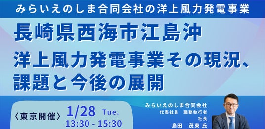JPI(日本計画研究所)は、みらいえのしま合同会社 代表社員 職務執行者 社長 島田 茂東 氏を招聘し、長崎県西海市江島沖における洋上風力発電事業その現況、課題と今後の展開について詳説いただくセミナーを開催します。