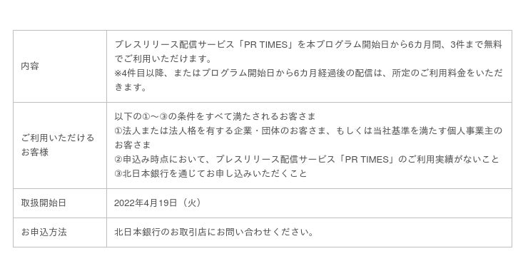 今回、岩手県を中心に地域密着型金融を推進する北日本銀行と、行動者による情報発信が増え、その情報が多くの方に伝わる状態を目指すPR TIMESとの協業が実現しました。これにより、北日本銀行のお取引先は、開始日から6カ月間、3件まで無料で「PR TIMES」にてプレスリリース配信できるプログラムをご利用いただけます。また、県内の事業者に向けて、PRの基礎からプレスリリース配信の実践までを講義するウェブセミナーの開催も予定しています。