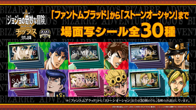 「ファントムブラッド」から「ストーンオーシャン」までの場面写が全30種類のオリジナルステッカーとなって、ランダムで1枚付いてきます。