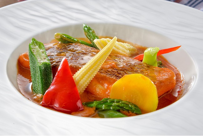 ・福岡県糸島産真鯛 トマトの旨辛クリーミースープ仕立て 海老風味 ¥2,800