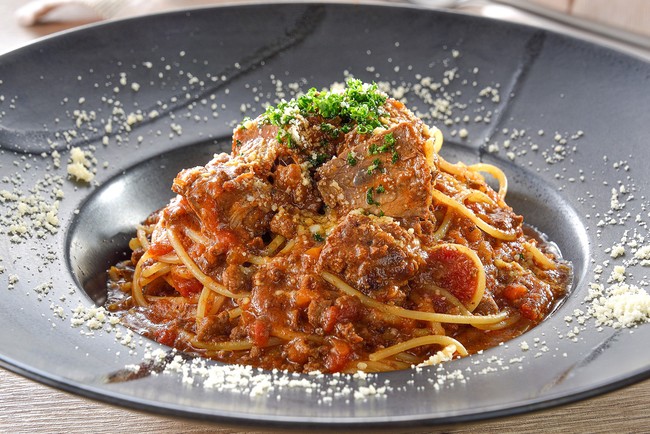 牛肉・トマト・玉ねぎ・赤ワインをじっくり煮込んだ、シンプルながらも味わい深いソースのボロネーゼ。「福山製麺所」が福岡県産小麦とカナダ産デュラム小麦を5対5の割合で配合し、10年かけて完成させた生パスタ「博多パスタ五五」を使用しています。