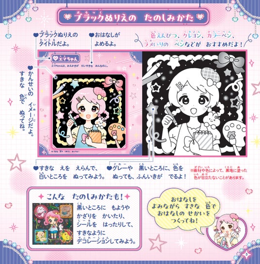 黒背景だから “はみだしてもかわいい”。女の子、魔女、プリンセス、お菓子などたっぷり22枚を収録!