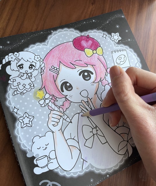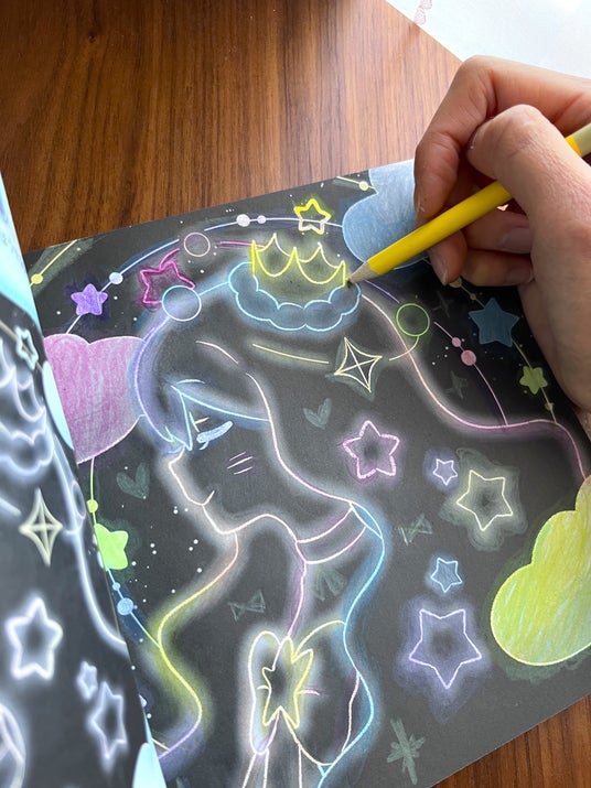 黒背景に明るい色が映え、少し塗るだけで絵がぐっと華やかに。はみ出してもかわいく仕上がるので、自信を持って塗り進められるのもポイントです。