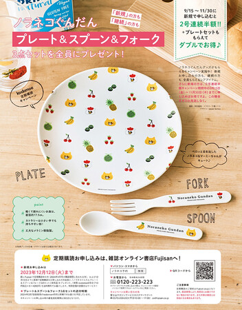 新規お申し込みの方も、すでに定期購読中の方(2024年4月号が購読期間に含まれる方)も、全員もれなく特典グッズがもらえる恒例キャンペーン実施中! 今回の特典は、ノラネコぐんだんプレート&スプーン&フォークの3点セット! ここでしか手に入らないレアアイテムです! 新規の方は、2号連続半額キャンペーン実施中の9月15日(金)以降に申し込むと、さらにお得です!(半額キャンペーンは11月30日(水)まで実施。)