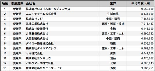 株式会社SalesNow(本社:東京都渋谷区、代表取締役:村岡功規、以下「当社」)は、国内540万社の企業情報を完全網羅した日本最大級のデータベース「SalesNow DB」より、上場企業を対象に愛媛県に本社を置く企業の平均年収データを集計・分析し、「平均年収ランキング」として公開いたしました。