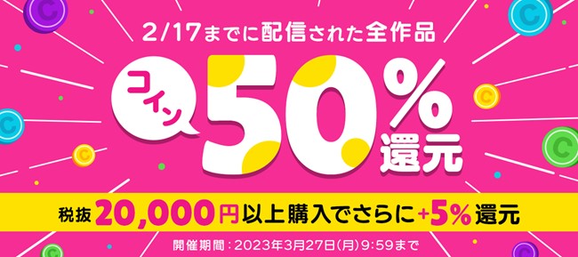 期間中、2023年2月17日までに配信された全作品を対象として、購入額の50%分がコインで還元されるキャンペーンです。コインは1コイン1円でBOOK☆WALKERでのお買い物にご利用いただけます。対象作品を税抜20,000円以上ご購入いただくと、後日さらに+5%分のコインが還元され、税抜価格に対して最大55%還元となります。