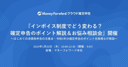 当社は、1月25日(木)に、確定申告セミナー『インボイス制度開始!確定申告のポイント解説&お悩み相談会』を開催します。2023年10月に施行されたインボイス制度の影響で、今回初めて行うユーザーも多い消費税申告のやり方や注意点、令和5年分確定申告のポイントを税理士が解説するほか、確定申告に関する相談を、その場で税理士や『マネーフォワード クラウド確定申告』のカスタマーサポート担当に相談できます。(※本イベントは、定員に達したため受付を終了しました。)