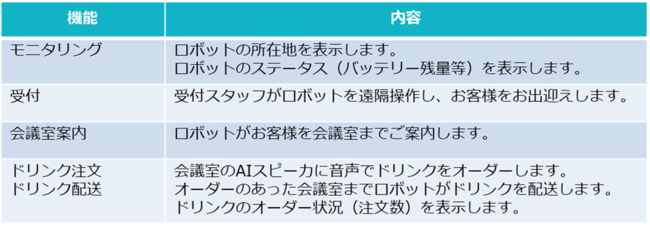 受付・案内・ドリンク配送業務において従来人が対応していた業務の一部をロボットが担います。