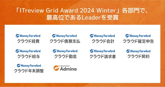 マネーフォワードグループが提供するプロダクトが、アイティクラウド株式会社主催「ITreview Grid Award 2024 Winter」の各部門にて、最高位である「Leader」を受賞しました。今回受賞したプロダクトは、株式会社マネーフォワードのバックオフィスSaaS『マネーフォワード クラウド』の9プロダクトと、マネーフォワードi株式会社の情シス向け業務OS『マネーフォワード Admina』です。