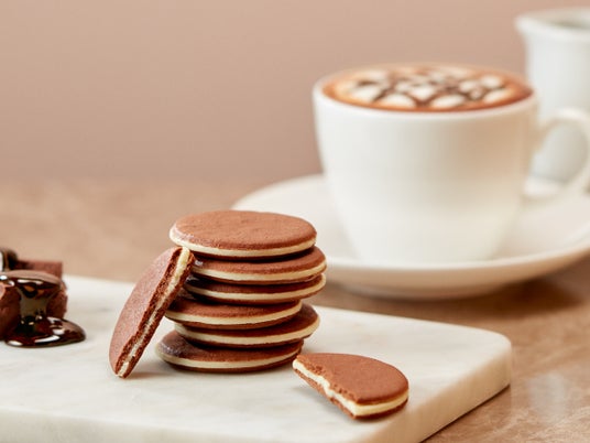 エスプレッソを効かせたクッキー生地で、ホワイトミルクのチョコレートをサンドしました。ショコララテのようなチョコレートの濃厚な甘さとミルクのクリーミーな味わいが広がります。