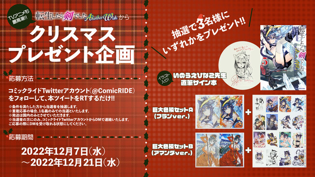 マイクロマガジン社(東京都中央区)はコミックライド編集部Twitterアカウントにて、『転生したら剣でした Another Wish』のクリスマスプレゼント企画を開催しております。