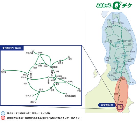 ○今後JR東日本エリア全域でご利用いただけるよう段階的にサービス提供エリアを拡大する計画であり、2025年10月1日より東北新幹線(郡山~東京間の新幹線各駅)と東京都区内のエリアを拡大します。