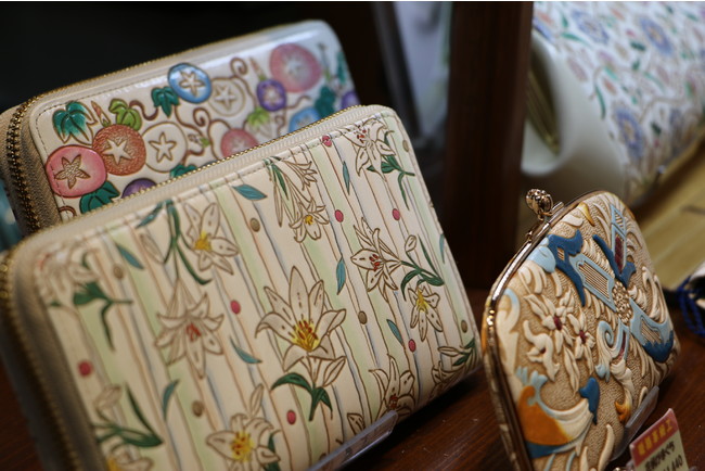 満腹になった2人は江戸時代に創業の姫路の伝統工芸「姫革細工」の小物を販売するお店へ。