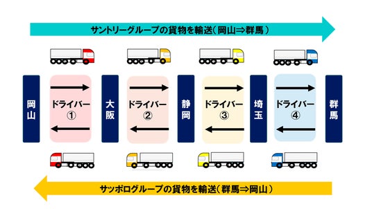 サントリーグループは、サッポログループと共同で、岡山県・群馬県間の長距離往復輸送の取り組みを11月13日(水)から開始します。