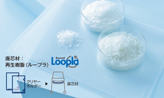 さらに、背クッションと座クッションの簡易交換機能を搭載したロングライフ設計により、サステナビリティにも取り組んでいます。座面の芯材の一部には、使用済みのクリヤーホルダーを回収し再資源化した再生樹脂「Loopla(ループラ)ペレット」を採用し、環境に配慮した製品設計を実現しました。