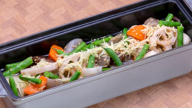秋野菜とサーモンの味噌チーズ焼き / 豚肉と里芋の照り焼き / 長芋の生姜風味マリネ など