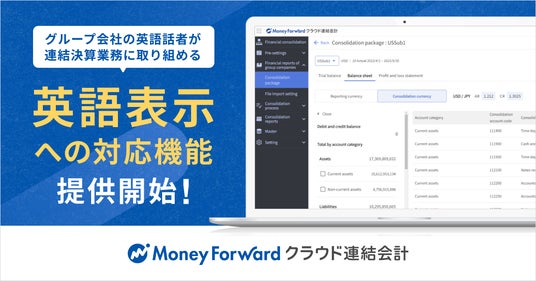 株式会社マネーフォワードは、『マネーフォワード クラウド連結会計』において、英語表示に対応し、日本語と英語の切り替えが可能になりました。これにより、海外子会社の英語話者が『マネーフォワード クラウド連結会計』に自らデータを入力することが可能になり、親会社と子会社がクラウド上で同じ連結決算データを共有することができます。