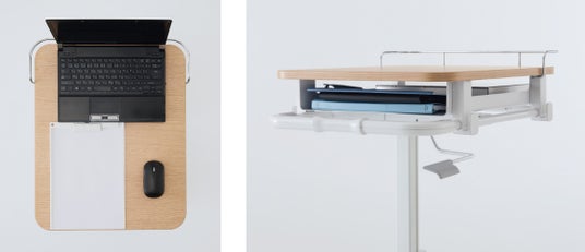 トレーは、大容量の大型トレーにさらにミニトレーを追加し、用途に合わせて分けて収納することができるため、これまで以上に物品の整理がしやすくなりました。また天板のサイズを従来よりも大きくすることで、ノートPCと縦型のクリップボード、マウスを同時に置くことができ、手元の情報を確認しながらPC入力がスムーズに行えます。天板の下にも広い収納スペースを設けているため、天板周りの書類や機器をすぐに収納でき、作業スペースの確保にもつながります。