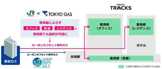 本施設では、JR東日本が整備する施設全体の共用部に東京ガスが提供するカーボンオフセット都市ガスを採用します。さらに共用部のみならず、JR東日本と東京ガスは、商業施設等の入居企業や賃貸レジデンスの入居者の専用部においてもカーボンオフセット都市ガスが選択可能となる仕組みを共創し、本施設利用者の皆さまがともにゼロカーボンのまちづくりに参画できる仕組みを新たに創設しました。なお、大規模複合開発において入居者の専用部までカーボンオフセット都市ガスの供給が選択可能になるのは国内初*2の取り組みです。