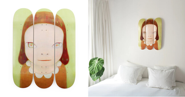 奈良美智の『Miss Margaret』(2016年)の複製画をあしらった3連作のスケートボード。著名な日本人アーティスト、奈良美智のトレードマークである、子供のような無垢さと大人の感情が同時に表現されています。また、奈良の後期の作品では、加齢で視力が変化したことに影響を受け、目の重要性を体現しています。