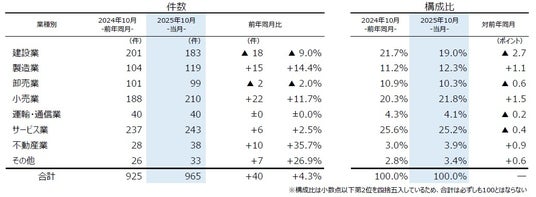 業種別にみると、7業種中4業種で前年を上回った。『サービス業』(前年同月237件→243件、2.5%増)が最も多く、全体の25.2%を占め、2000年以降で3番目に多かった。最も高い増加率を示した『不動産業』(同28件→38件、35.7%増)は、5カ月連続で前年を上回り、過去10年で最多となった。『小売業』(同188件→210件、11.7%増)は、10月としては2008年(231件)以来17年ぶりに200件を上回った。