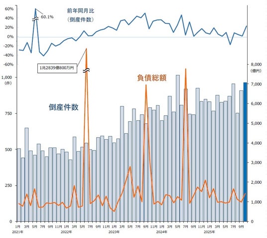 株式会社帝国データバンクは、2025年10月の企業倒産件数(負債1000万円以上の法的整理が対象)について集計し、分析を行った。
