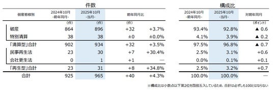 『清算型』では、「破産」が896件(前年同月864件、3.7%増)で最も多く、全体の92.8%を占めた。「特別清算」は38件(同38件)で、10月としては前年に並び、2000年以降最多タイとなった。