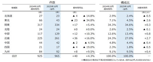 地域別にみると、9地域中4地域で前年を上回った。最も件数が多かったのは、『関東』(前年同月317件→334件、5.4%増)で、5カ月連続で前年を上回り、10月としては過去10年で最多となった。一方、『東北』(同66件→43件、34.8%減)は、2カ月ぶりに前年を下回った。