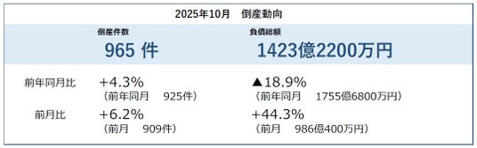 2025年10月の全国企業倒産は965件発生し、前年(925件)を40件(4.3%増)上回った。5カ月連続で前年を上回り、今年最多となった。2025年1-10月の累計は8584件となり、前年同期(8219件)を365件・4.4%上回った。一方、負債総額は1423億2200万円となった。前年(1755億6800万円)を332億4600万円(18.9%減)下回り、2カ月連続で前年を下回った。